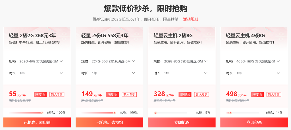 | 轻量云主机 | 4核32G8M | 8M带宽 | 1500GB月流量 | 100G SSD系统盘 | 华北-北京 | 998元一年 |