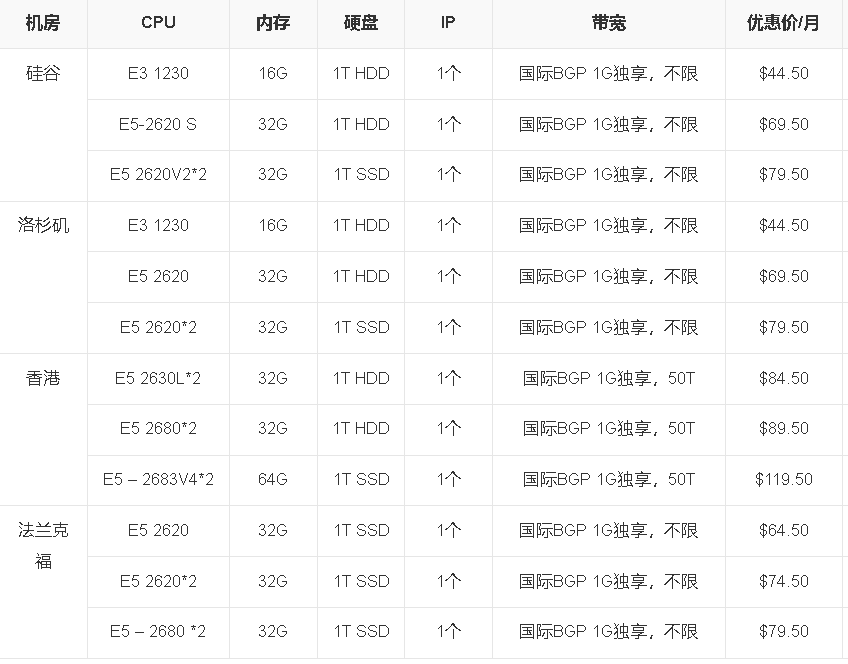 以下列出方案为部分热销配置,涵盖硅谷、洛杉矶、香港和法兰克福数据中心,其中硅谷、洛杉矶和法兰克福大带宽不限流量,香港为50T流量限制,首月价格低至$44.5。带宽为国际BPG 1G独享,支持扩展至2G。