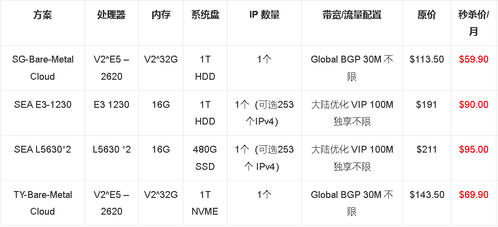 RAKsmart年末秒杀方案精选新加坡、日本和西雅图机房的高性价比裸金属和站群服务器,新加坡裸机云服务器V2^E5 – 2620、V2^32G、HDD^1T配置价格低至$59.9/月;日本裸机云服务器V2^E5 – 2620、V2^32G、NVME^1T方案低至$69.9/月;美国西雅图站群服务器E3-1230和L5630*2方案低至$90/月,所有秒杀产品续费同价,每日限量20台,每个用户当月限购5台,先到先得,售完即止!