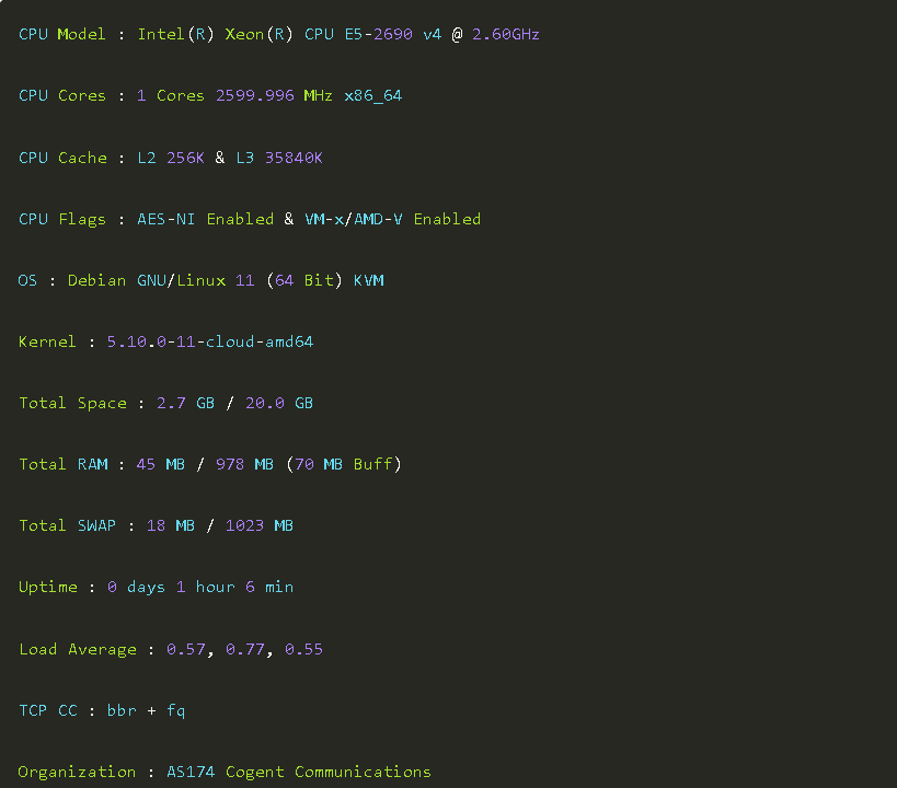 性能方面,母鸡为 Intel(R) Xeon(R) CPU E5-2690 v4 处理器,Geekbench 6 单核得分815,单核性能一般,适用于部署面开发测试、流量转发和专线落地等。