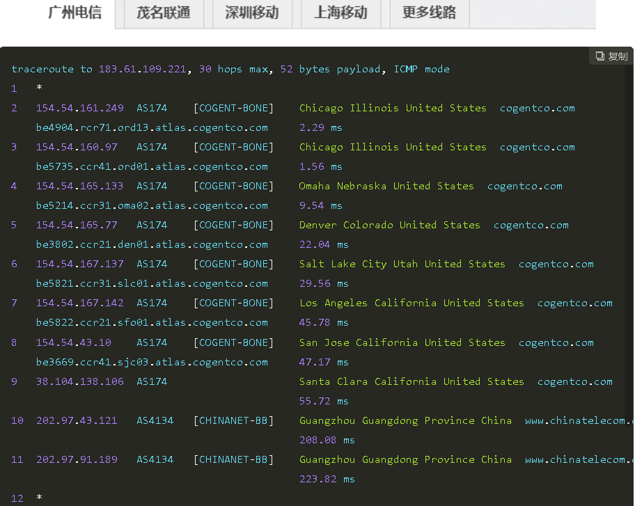 | 19 | 154.54.161.254 * 154.54.161.254 | 美国伊利诺伊州芝加哥 cogentco.com * 美国伊利诺伊州芝加哥 cogentco.com | AS174 * AS174 | 782.4 * 747 |
