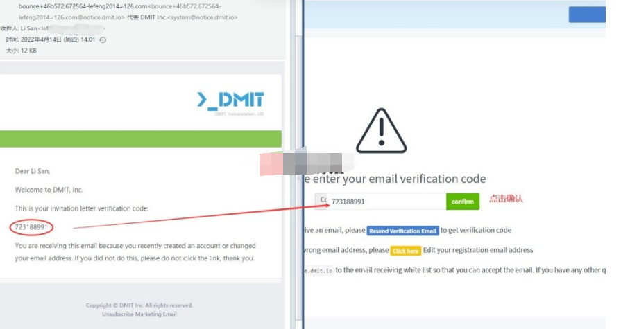 2、创建后需要验证你邮箱是否正确,这里需要填写一个验证码,在你上一步填写的【邮箱】中会收到一封发自DMIT的验证码邮件,将邮件中的验证码填写到对应输入框中,并点击”confirm”按钮提交,如下所示: