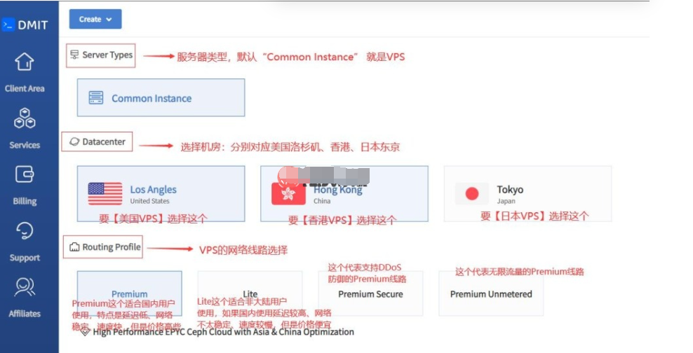 4、接下来就是选择VPS套餐了,看你是需要购买美国VPS、香港VPS还是日本VPS,另外就是需要注意“Premium”和“Lite”套餐的区别(DMIT本身就是以速度著称,所以最好是选择Premium线路,这种线路也被更多的用户所接受,如果你只是想价格便宜那么就没有选择DMIT的必要了),这些都是示例图上有说明,如下所示: