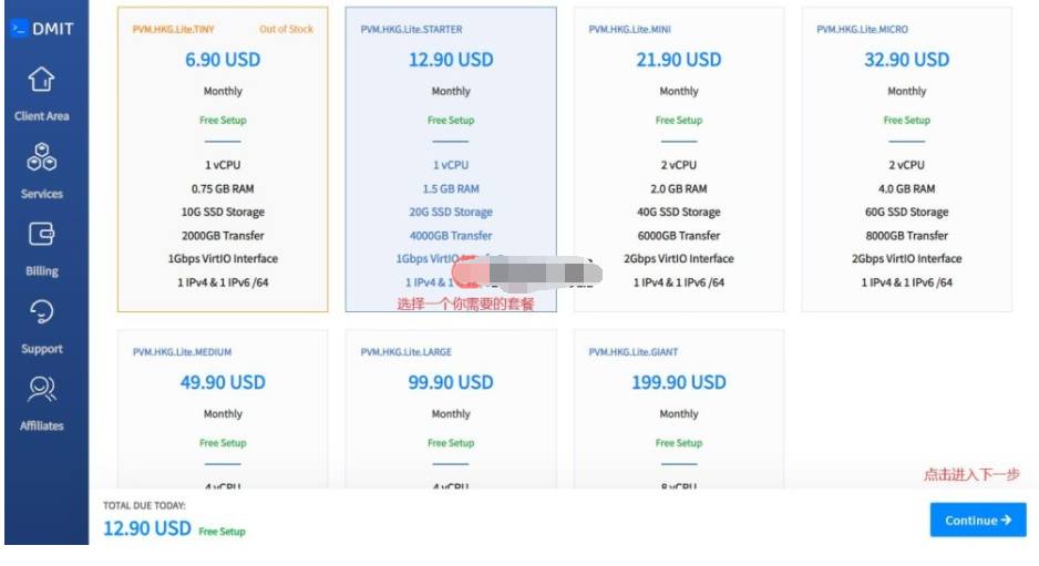 5、接下来就是选择一个你需要的套餐,因为DMIT卖得非常的好,所以很有可能一些套餐是没有库存的,所以选择一个有库存的套餐后(有点套餐是按月“Month”付款,有的按季度“Quarterly”付款,一般来说购买时间越长价格越便宜),点击“Continue”按钮,如下所示: