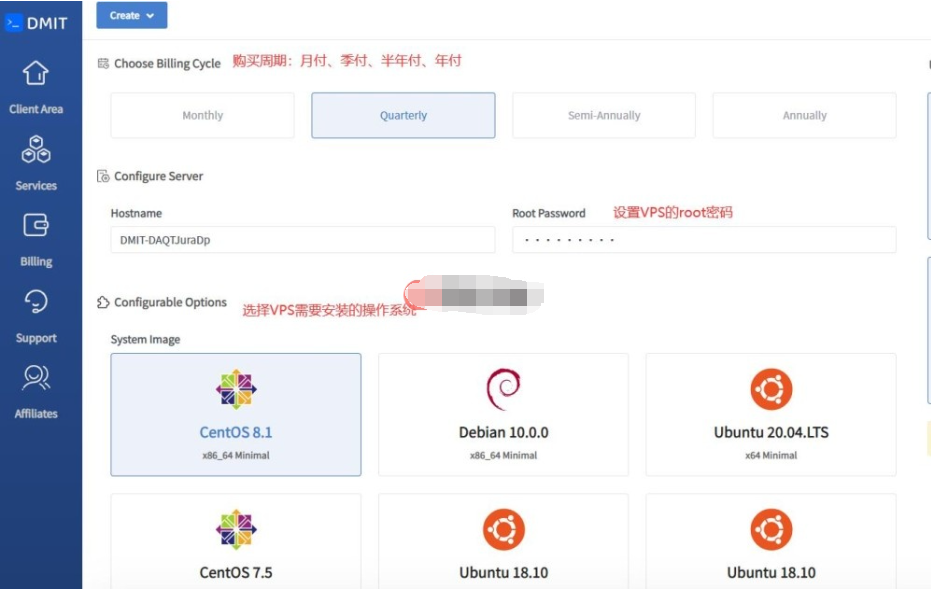 6、接下来先选择付款周期,然后这是VPS的root登录密码,接着选择VPS需要安装的操作系统,如下所示: