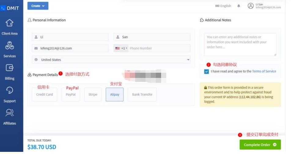 9、最好需要选择付款方式,一般我们会选择信用卡、PayPal和支付宝中的一种付款方式,勾选同意相关协议,最后点击“Complete Order”按钮提交,如下所示: