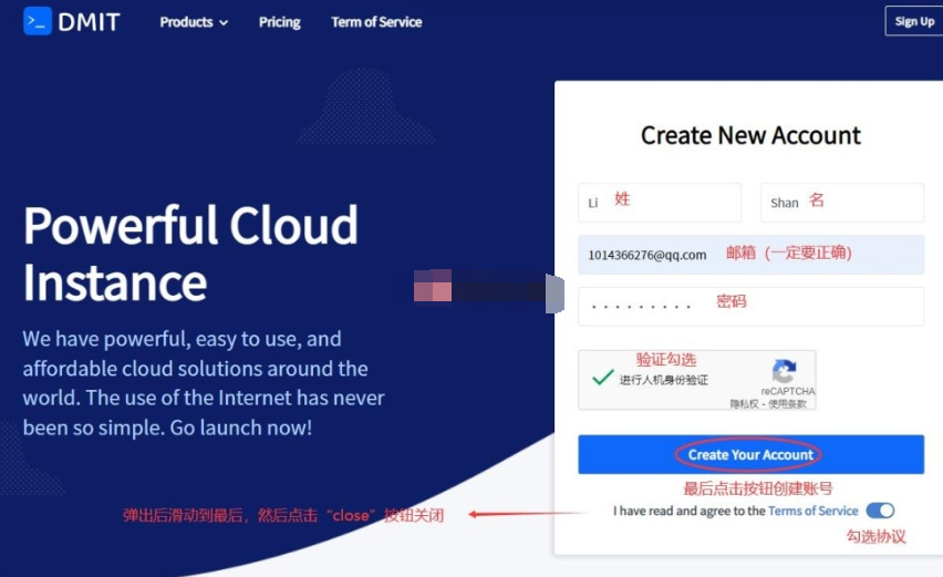 1、进入DMIT官网后,首先要完成用户注册。在首页注册界面,依次填写姓、名(注意要用拼音填写,不能出现中文)、邮箱和密码。填完信息后,勾选人机身份验证,完成验证码验证。接着勾选协议,鼠标将协议内容滚动到最后,等倒计时结束,点击 “Close” 按钮关闭协议弹窗,最后点击 “Create Your Account” 提交注册信息。