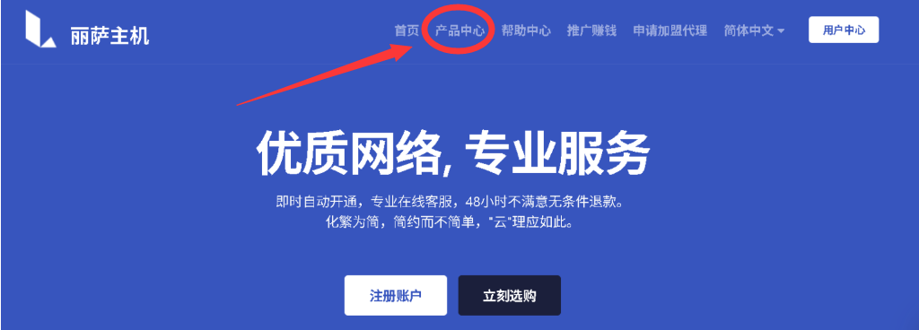 1、首先进入丽萨主机首页,然后点击“产品中心”选项,这样会进入产品方案列表页面,如下图所示(如果没有账号,请先注册):