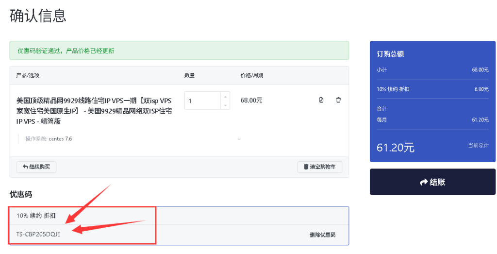 6、lisahost优惠码填写之后,点击验证按钮,这样就可以享受折扣,最后确认无误后点击确定按钮即可: