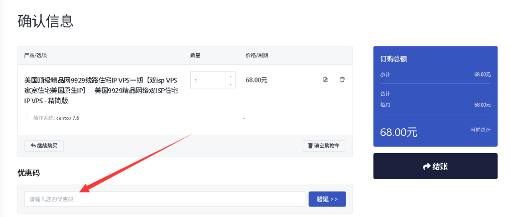 5、进入丽萨主机优惠码填写页面,这里填写唯一指定优惠码TS-CBP205DQJE,如下图所示: