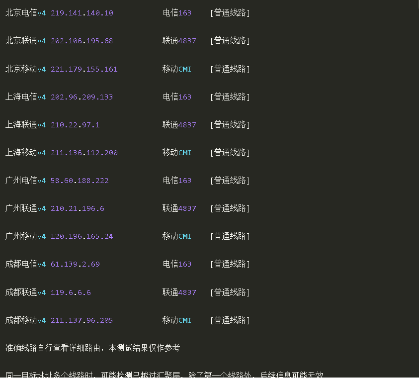 以下为IPV4网络测试,若无IPV4网络则无输出