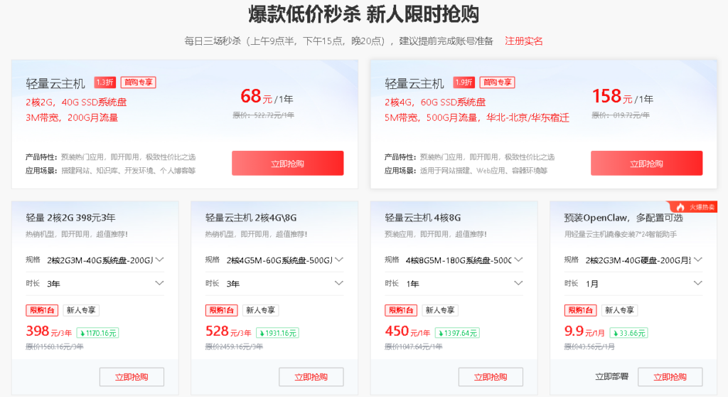 - 经济型e实例:99元/年(2核2G/3M固定带宽/不限流量)
