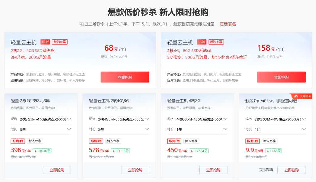 - 轻量云主机:8核32G、100G SSD系统盘、10M带宽、2000G月流量,报价1798元一年、4998元3年