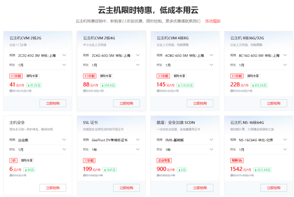 - 云主机CVM:4核8G、5M带宽、60G系统盘、不限流量,价格145元1个月、418元3个月、798元6个月、1458元1年、4298元3年