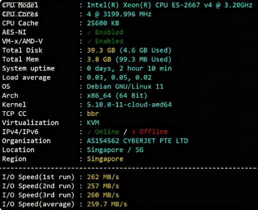 Intel E5-2667 v4系列CPU(4核心,主频为3199.99MHz),4GB内存,SSD硬盘,1Gbps带宽,Debian GNU/Linux 11系统: