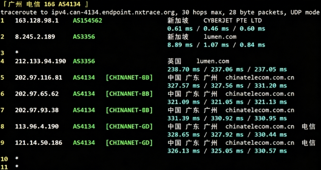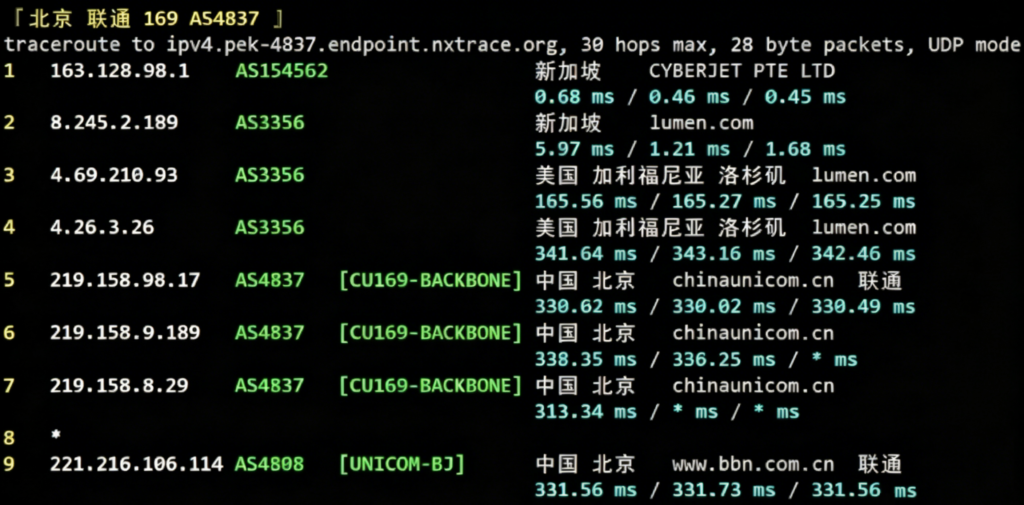 联通回程路由节点测试结果: