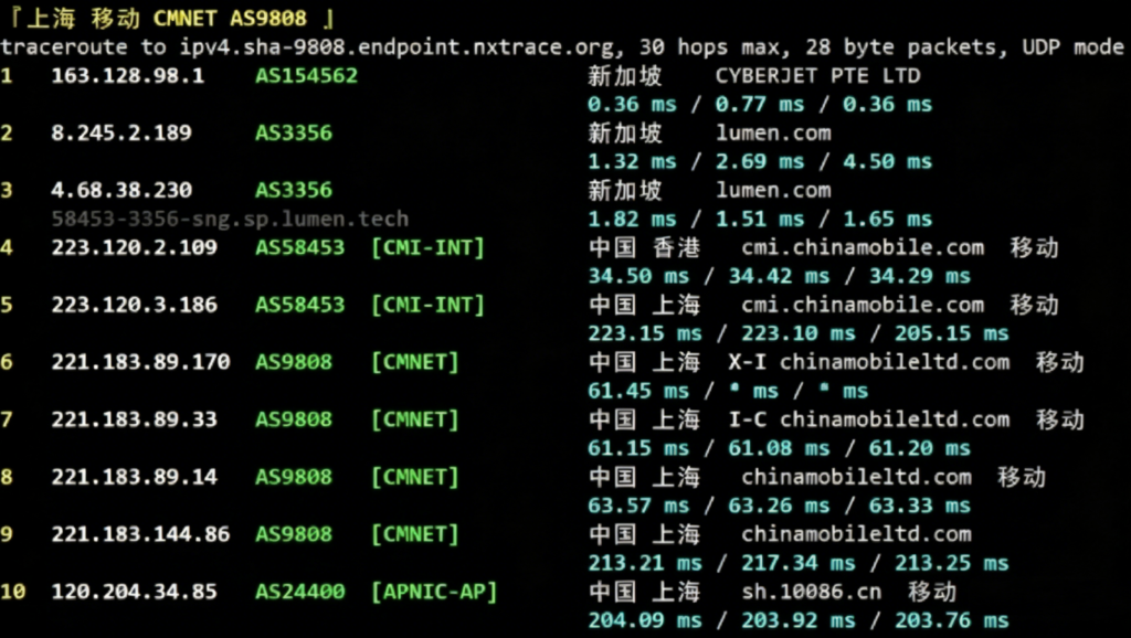 移动回程路由节点测试结果: