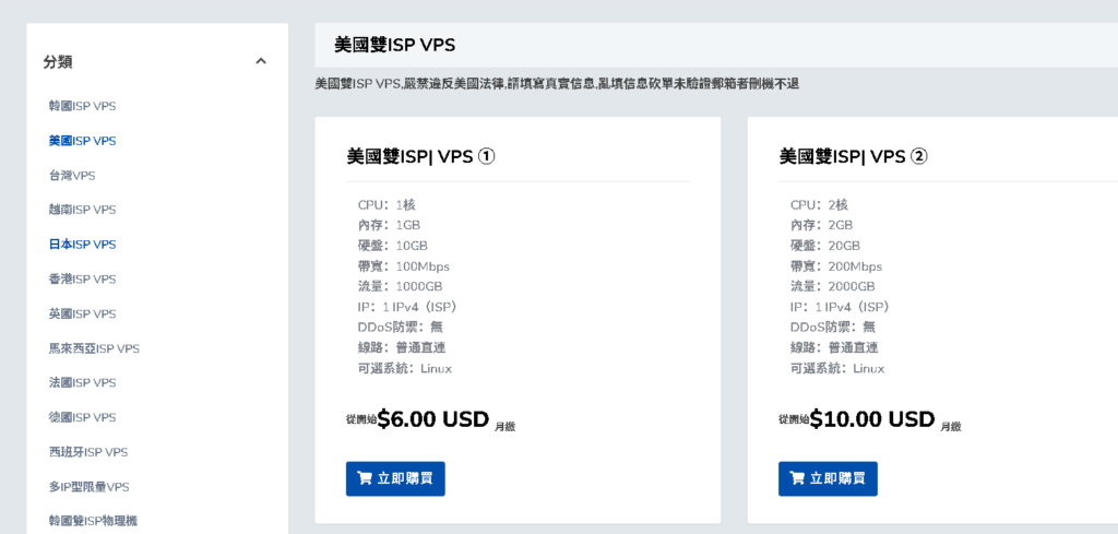 | 1核 | 1G | 10G | 100M/1T | $6/月 | 点此入手 |