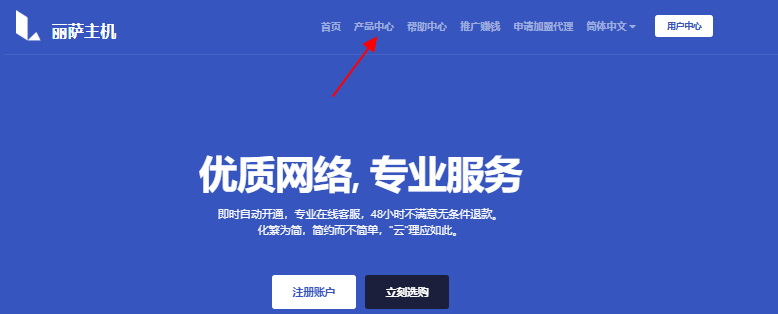 1、首先进入丽萨主机官网(www.lisahost.com)首页,然后点击“产品中心”选项,这样会进入产品方案列表页面,如下图所示(如果没有账号,请先注册):