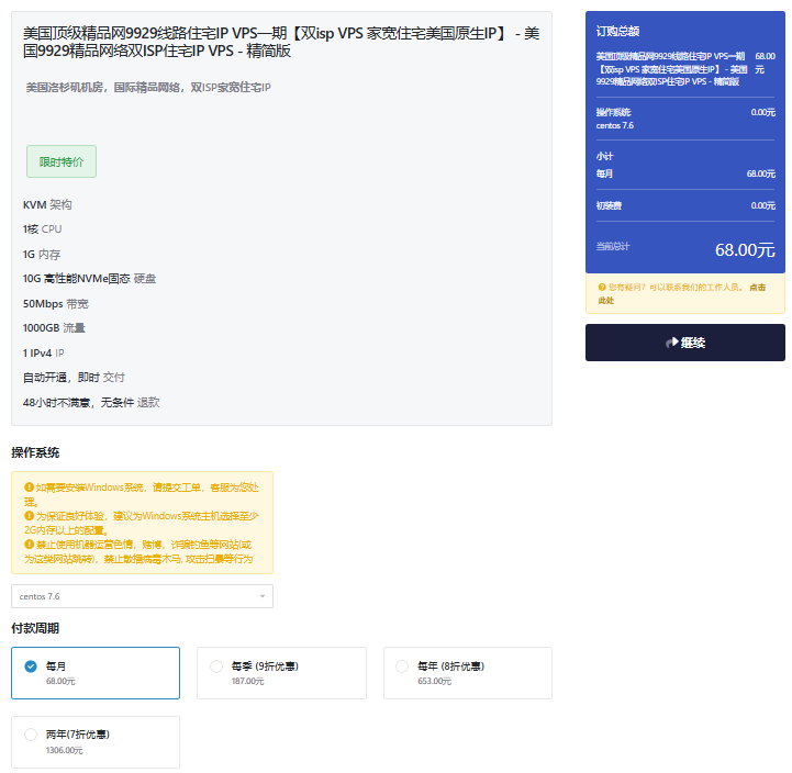 4、选好方案之后,点击立减订购按钮,这样会进入订单详情页面,选择好付款周期之后点击“继续”按钮,如下图所示: