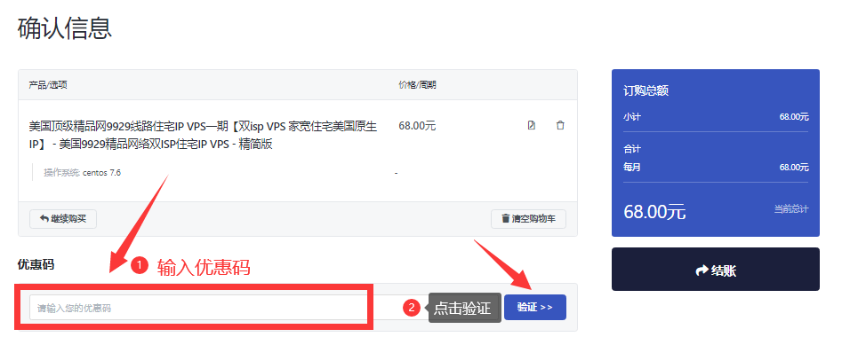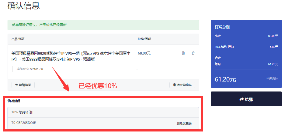 6、lisahost优惠码填写之后,点击验证按钮,这样就可以享受折扣,最后确认无误后点击确定按钮即可:
